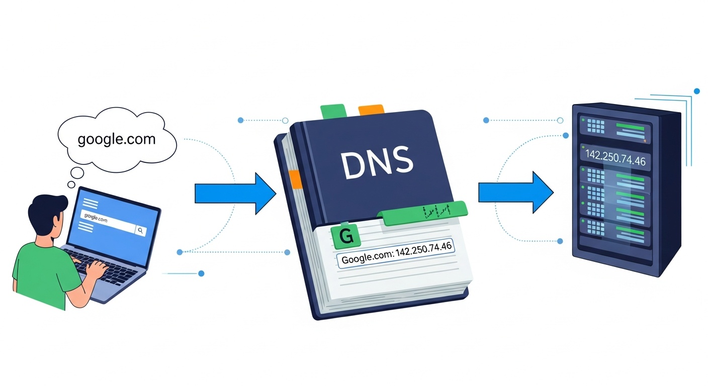In simple words, computers don't understand words. They communicate through numbers, specifically, IP addresses like 142.250.74.46. Every website, every server, every device connected to the internet has one. But nobody memorizes strings of numbers. We type "google.com" and expect the internet to figure out the rest. DNS is what makes that possible. It's a globally distributed system that translates human-readable domain names into the numerical IP addresses that machines actually use. Think of it as the internet's phone book: you look up a name, it gives you the number, and the call goes through.